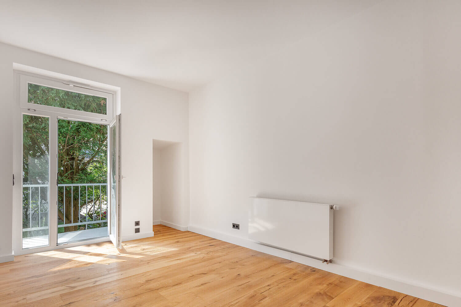 Im rechten Teil der Wohnung findet sich das Wohnzimmer von hier aus gelangen Sie auch in das Schlafzimmer. Durch die großen Fenster haben Sie in den Räumen einen angenehmen Lichteinfall. Gerne können wir jederzeit einen Besichtigungstermin vereinbaren.