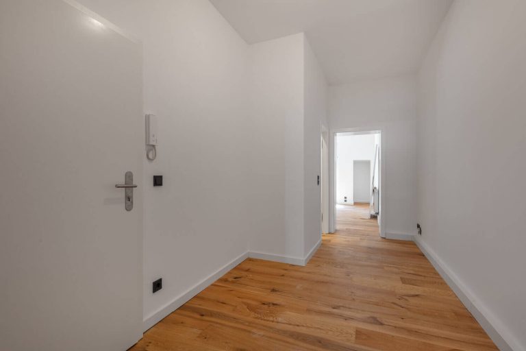 Sie betreten die Wohnung im 1.Obergeschoss über das herrschaftliche Treppenhaus. Durch die Wohnungseingangstür mit hoher Sicherheitsstufe gelangen Sie direkt in die großzügige Diele mit ausreichend Platz für eine Garderobe. Im linken Teil der Wohnung befindet sich das moderne Badezimmer mit bodentiefer Dusche und die große Küche mit angrenzendem Balkon.